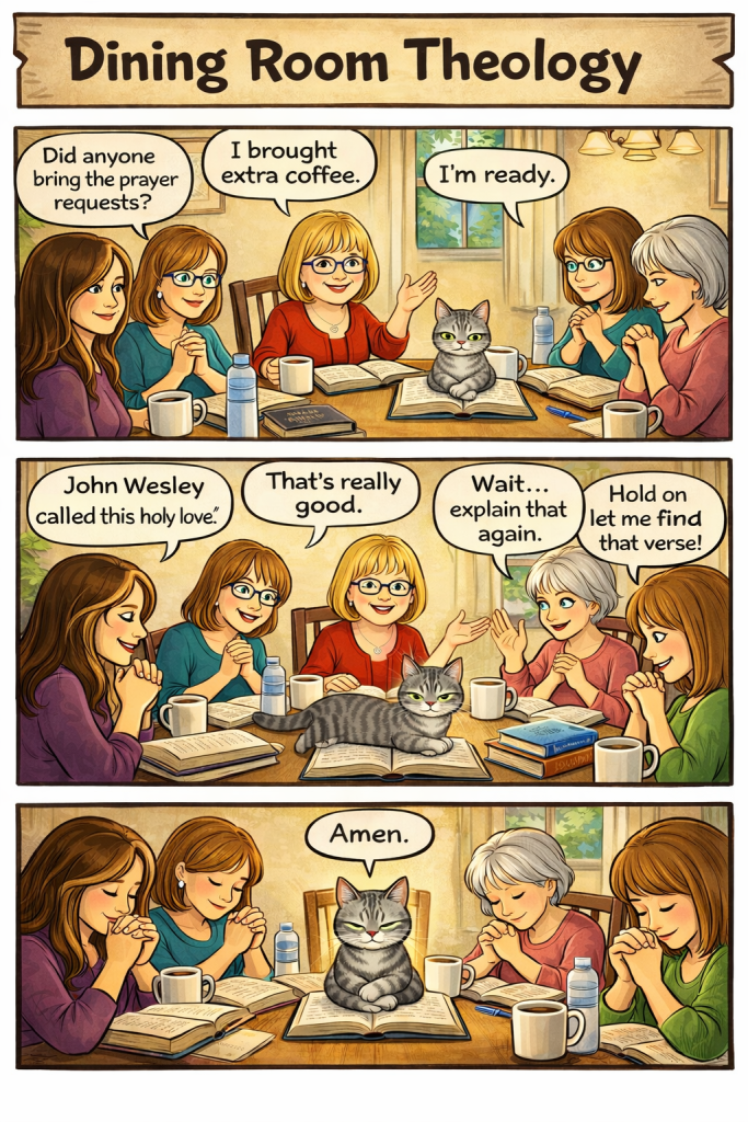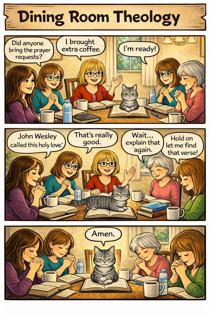 Welcome to Dining Room Theology — where the coffee is strong, the Bibles are open, the conversation is lively, and apparently even the cat prays.