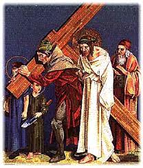 Jesus is helped by Simon to carry the Cross. Mark 15:21
